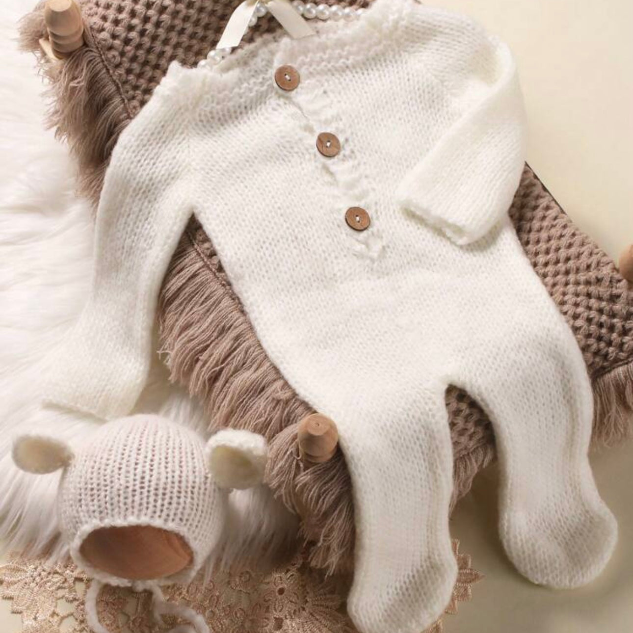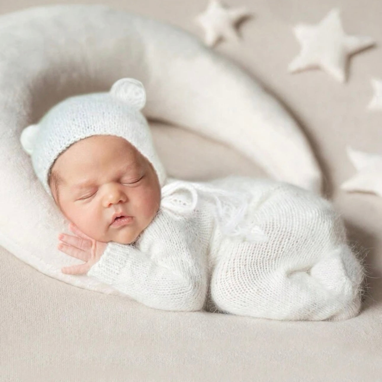 Supermyk og godt sett i mohair. Settet er perfekt til nyfødtfotografering da det er onesize 0-1 mnd. Settet består av heldress og lue med knyting.
